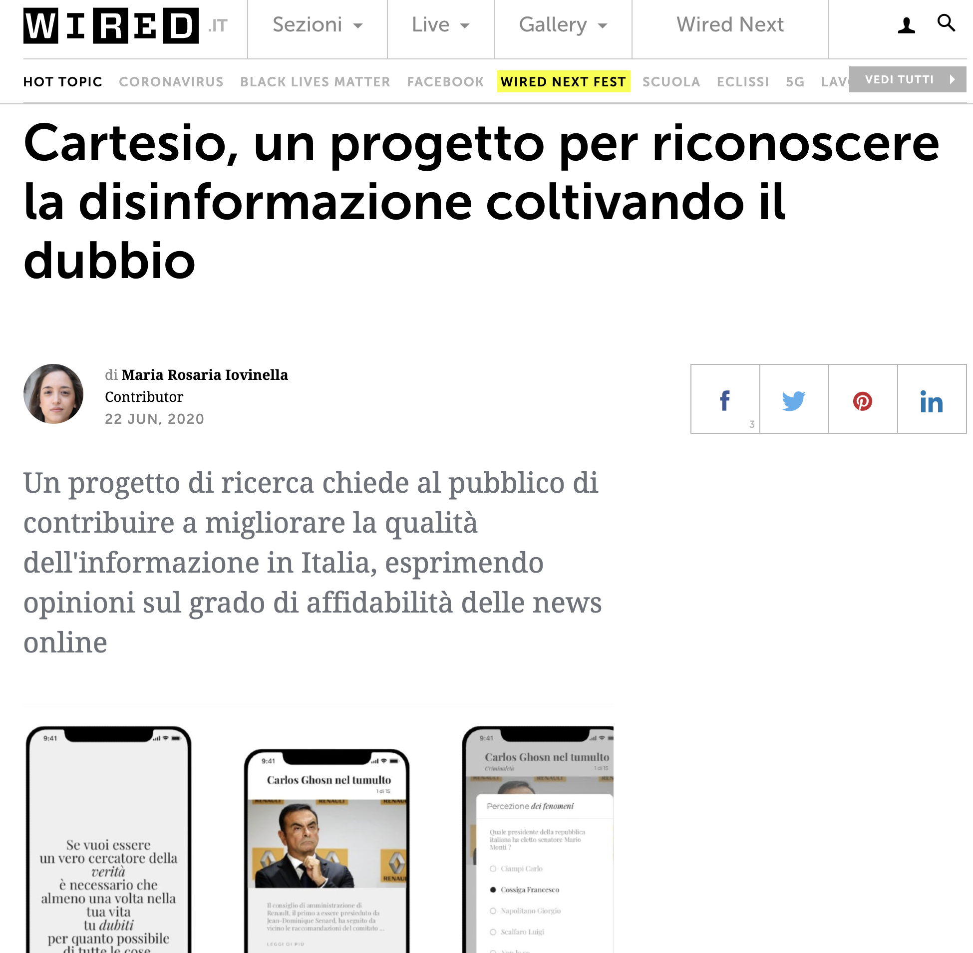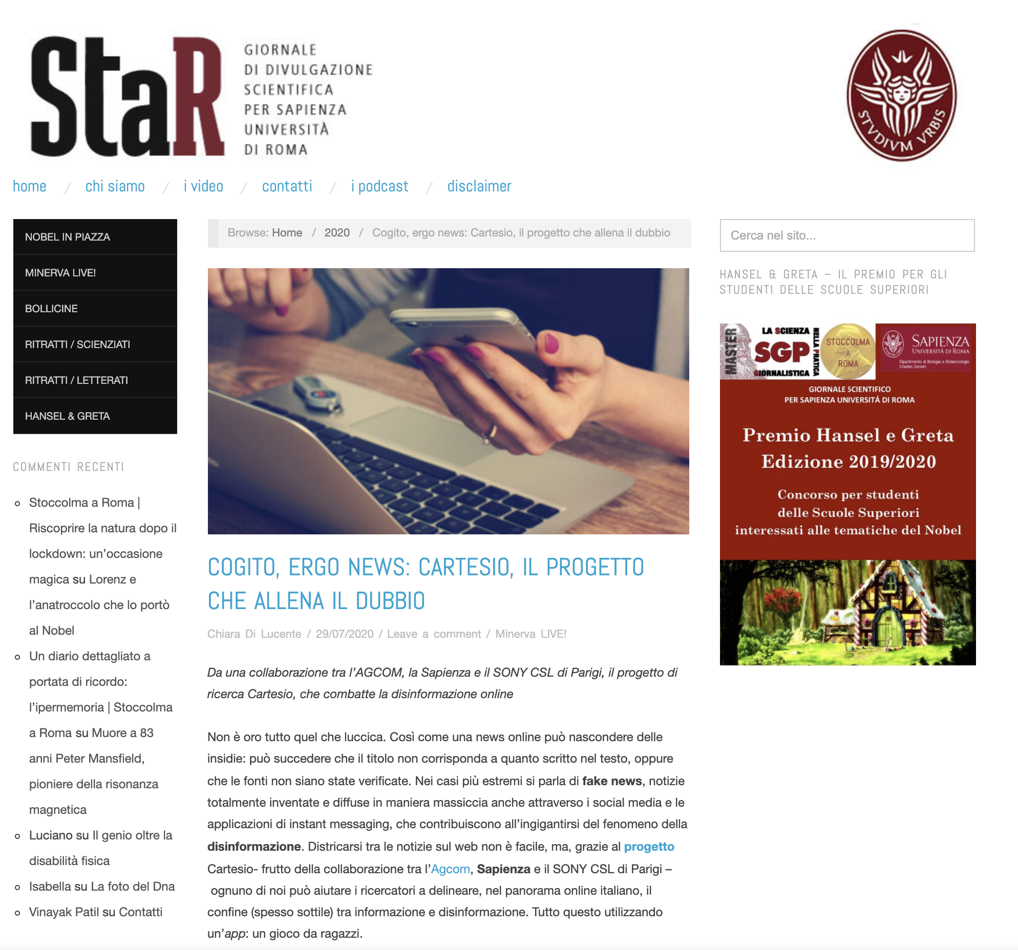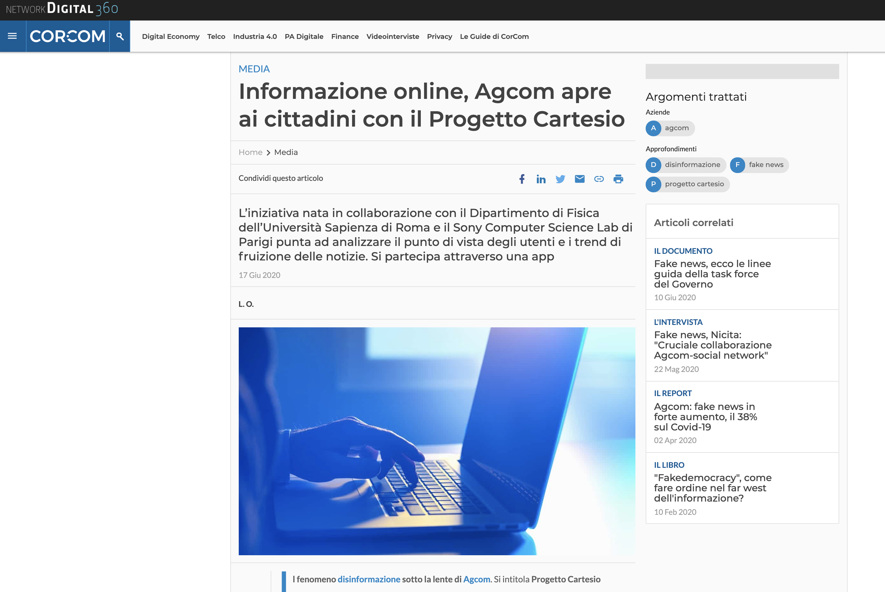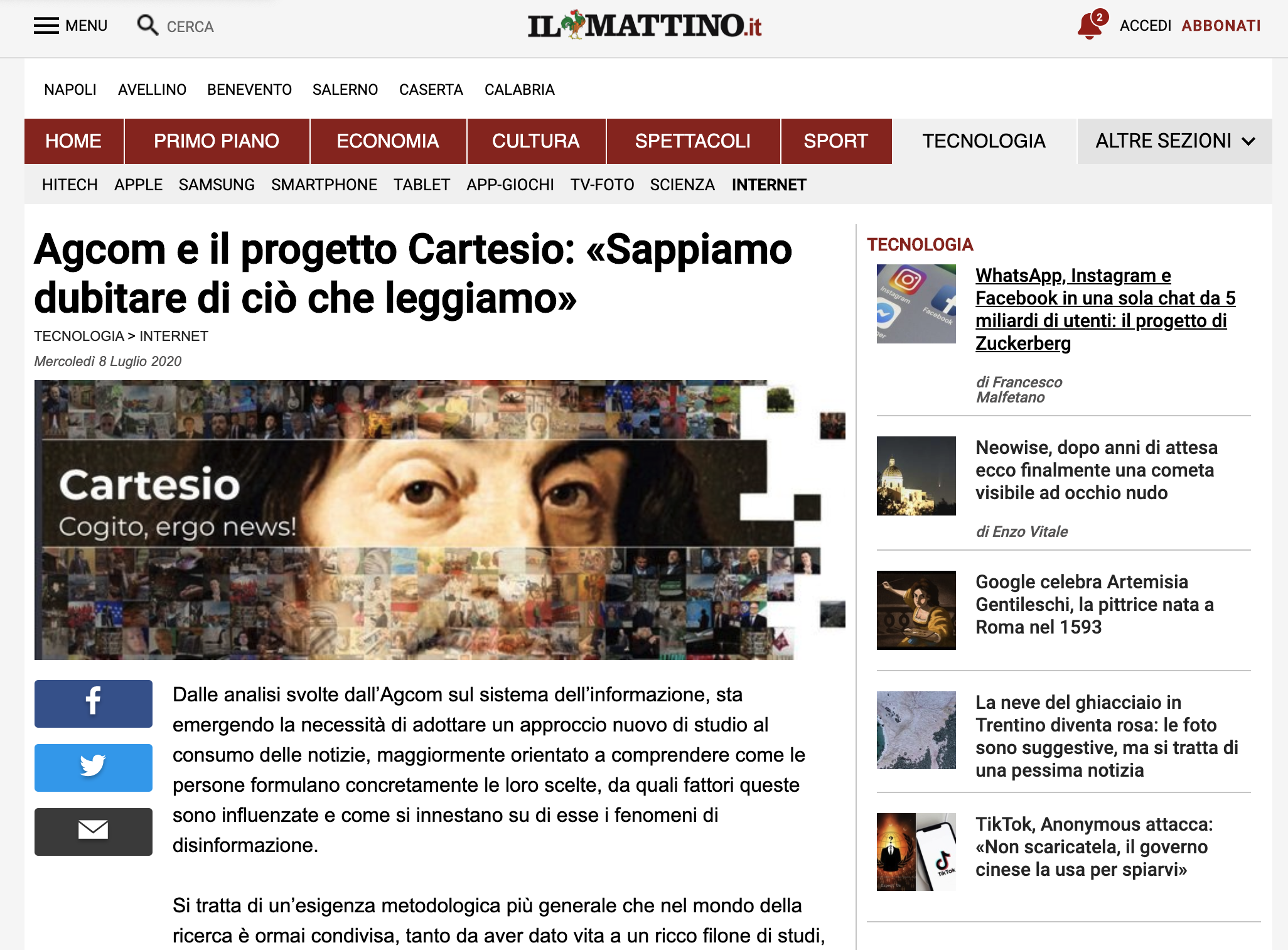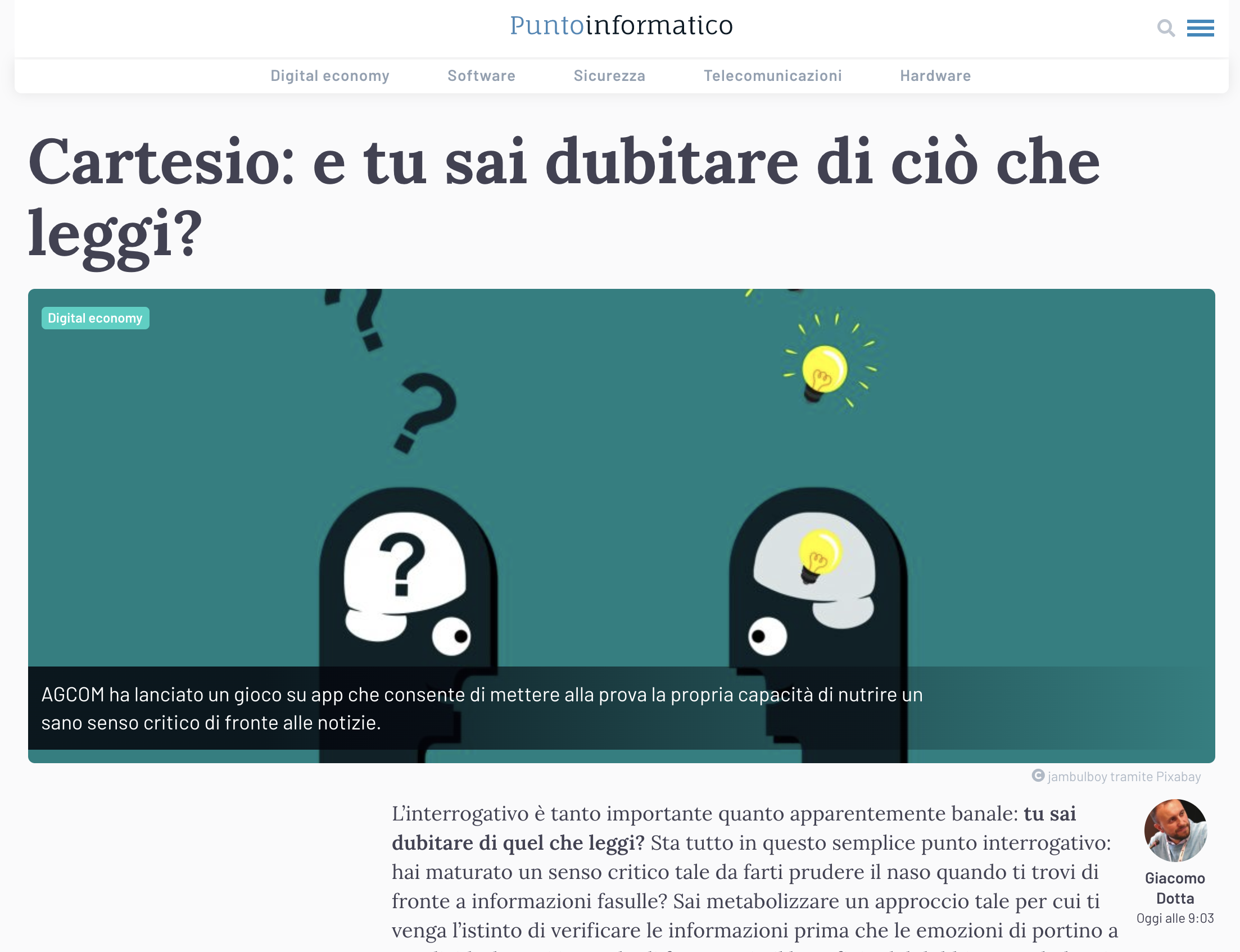 La diffusione di notizie false è un pericolo per la formazione dell’opinione pubblica in una società democratica in cui il sistema dell’informazione e dei media giocano un ruolo fondamentale. Orientarsi non è facile, soprattutto sul web: la molteplicità di fonti, la rapidità di aggiornamento delle notizie, l’abbondanza di informazioni complicano la scelta. Partecipando al progetto Cartesio puoi contribuire in prima persona a fornire gli elementi conoscitivi per aiutare i cittadini a districarsi nel sistema dell’informazione online. Basta rispondere a poche domande e dire la tua: durante l’esperienza potrai valutare l’affidabilità delle notizie ed esprimere la tua opinione su alcuni dei più importanti fenomeni che coinvolgono la nostra società. Il tuo contributo aiuterà a comprendere meglio come vengono percepite le notizie e a migliorare la qualità dell’informazione!