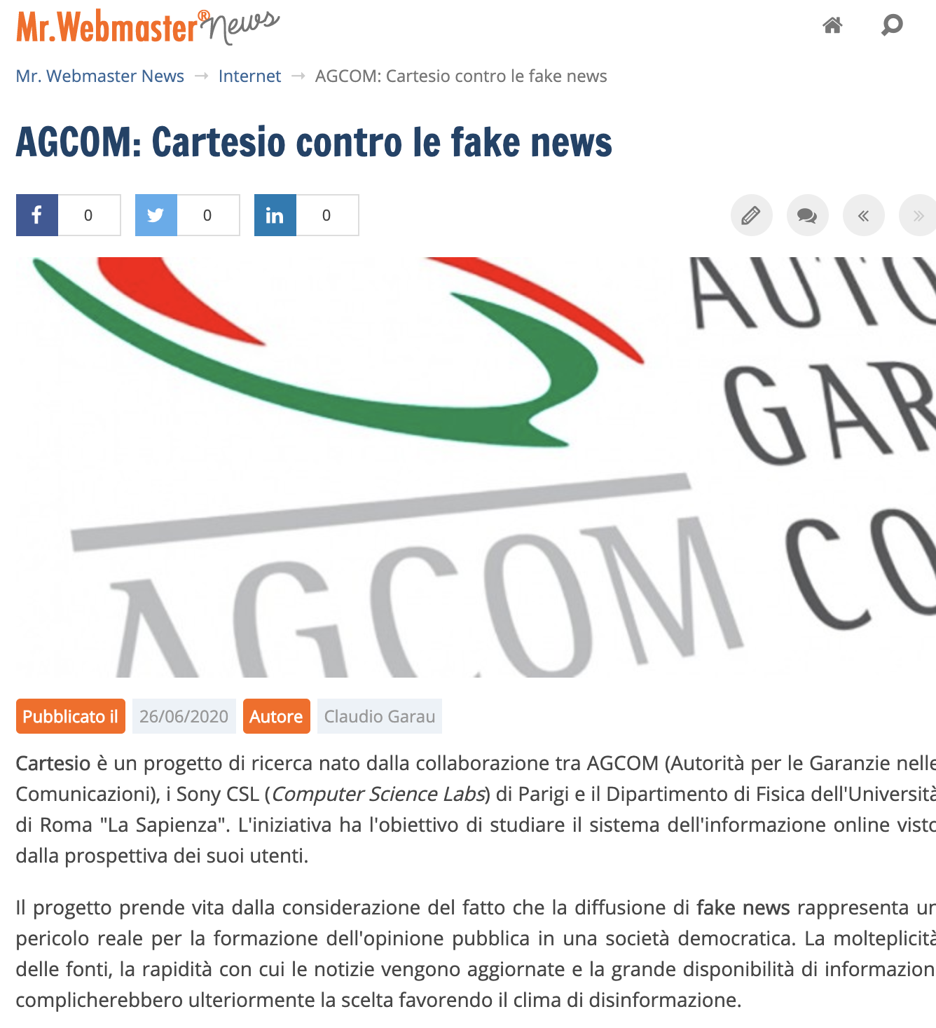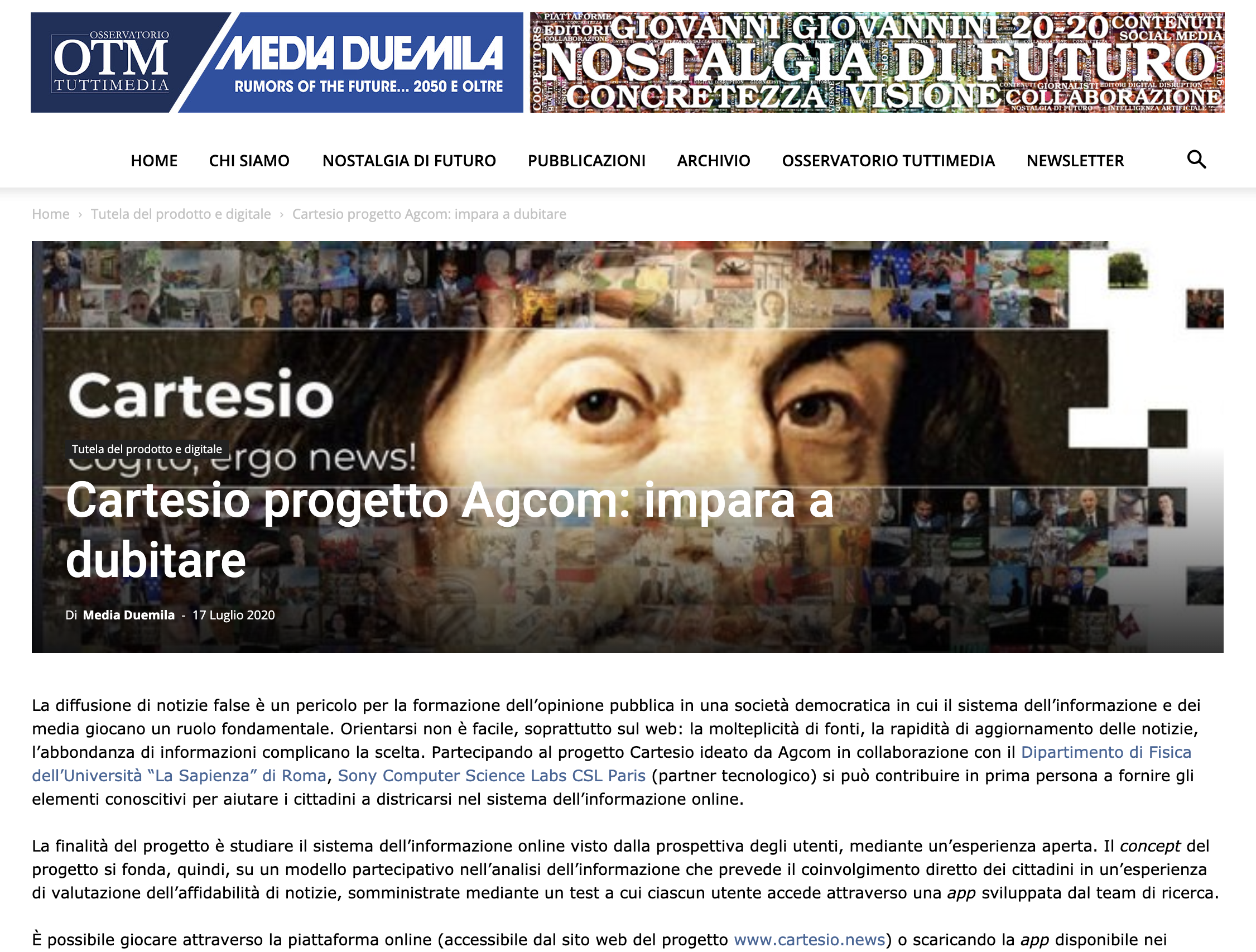 Cartesio è un progetto di ricerca frutto della collaborazione tra l’Autorità per le Garanzie nelle Comunicazioni (AGCOM), i Sony Computer Science Labs (CSL) di Parigi - partner tecnologico - e il Dipartimento di Fisica dell’Università di Roma “La Sapienza”. Cartesio ha l’obiettivo di studiare il sistema dell’informazione online visto dalla prospettiva degli utenti, mediante un’esperienza aperta. Attraverso la partecipazione diretta dei cittadini, Cartesio costituisce un’occasione per comprendere come sono percepiti alcuni fenomeni sociali, come sono valutate le informazioni e quali sono gli argomenti prioritari per i cittadini, nel totale rispetto della privacy. Proponendosi, inoltre, come un’iniziativa trasparente di ricerca, al termine del progetto i risultati saranno resi pubblici e divulgati e i dati della ricerca saranno resi disponibili in forma aggregata e in formato open data. È possibile giocare attraverso la piattaforma online o scaricando l’App. Basta semplicemente registrarsi (in maniera completamente anonima), scegliere gli argomenti di interesse ed iniziare a giocare, fornendo una valutazione soggettiva della qualità delle informazioni ricevute. Al termine dell’esperienza, si potranno avere più informazioni sulla qualità dell’informazione percepita durante l’esperienza e sulla percezione degli altri partecipanti. Inoltre, ripetendo l’esperienza nel tempo, sarà anche possibile osservare come queste percezioni si evolvono.